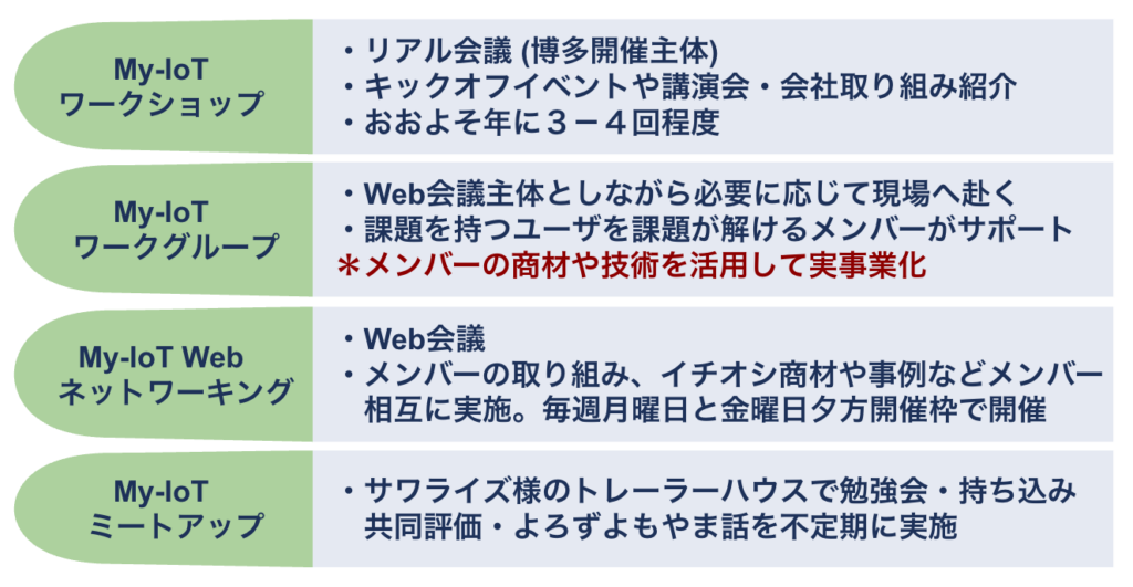 My-IoTは以下のように大まかに4つの活動母体があります。