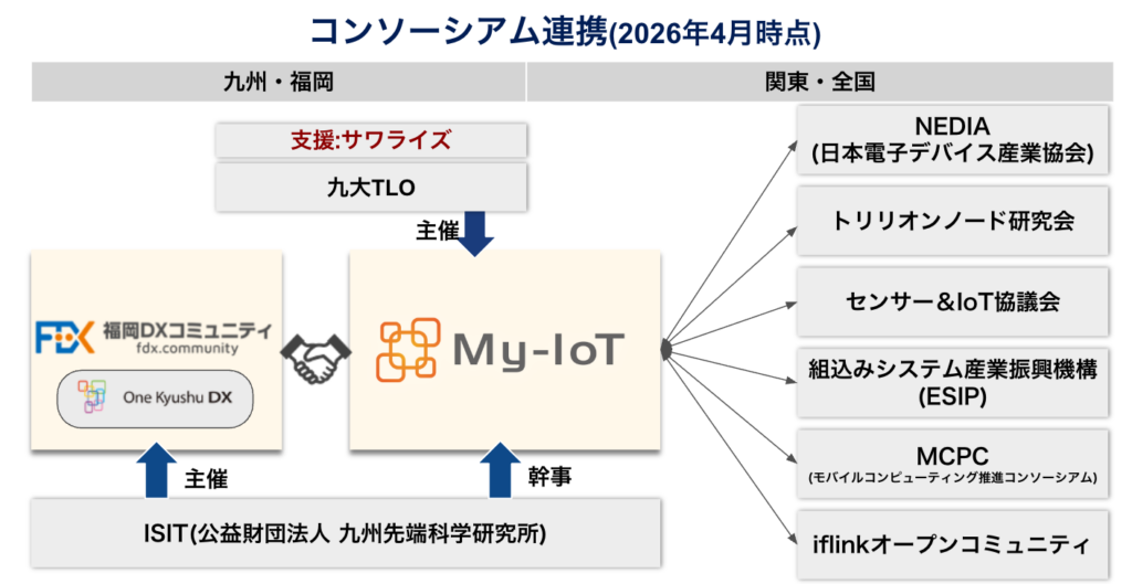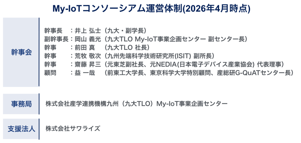 2019年度にMy-IoTワーキンググループとして活動を開始し、2021年度に現在の形のMy-IoTコンソーシアムを株式会社産学連携機構九州(九大TLO)内に設立しました。