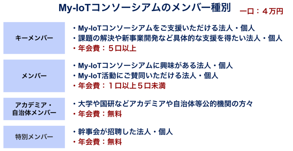 キーメンバーは具体的な課題をお持ちで、解決にアドバイスや支援を得たい場合や、My-IoTコンソーシアムの趣旨に賛同していただいて資金的ににご支援いただけるメンバーです。